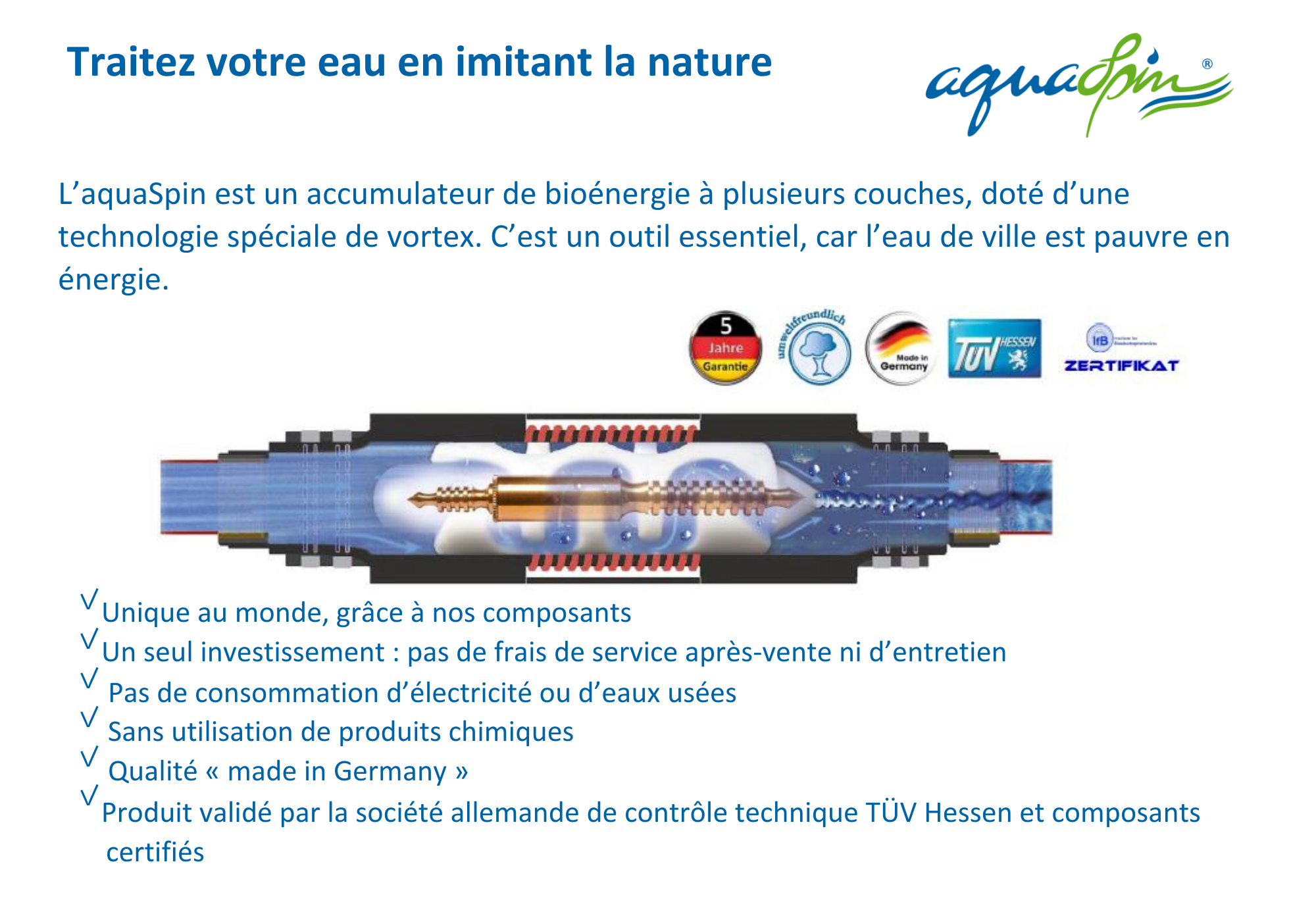 Grâce à sa Technologie “Made in Germany”, la plus innovante du Monde, L’AQUASPIN prévient efficacement l'accumulation de calcaire et de rouille, protégeant ainsi vos canalisations et appareils électroménagers. L’état du calcaire se modifie dans vos installations (tuyaux, chauffe-eau, chauffages) et vos équipements sont ainsi préservés de l'oxydation.